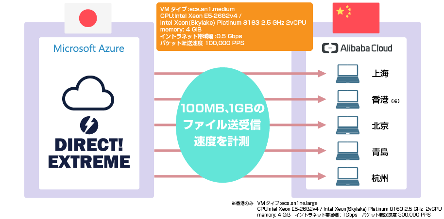 今回のテスト構成はAZUREの東京リージョンに対して、中国国内の端末からアクセスして、東京の弊社オフィスから中国国内の端末に対して100MBと1GBのファイルを送受信する形で実施することとしました。通信の比較に使うのは弊社の高速ファイル転送サービス「DIRECT!EXTREME」。通常モードと高速モードで比較します。