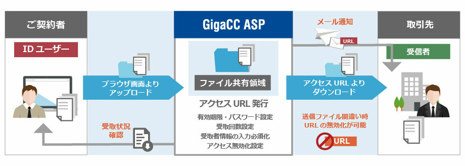 日本ワムネットが提供しているビジネス用オンラインストレージサービス「GigaCC ASP(以下、GigaCC)」では、ダウンロードに必要なパスワードや有効期限の設定のほか、サーバ内でのファイル暗号化やウイルスチェック、証跡管理のための履歴ログ管理など、企業間でセキュアかつ効率的にファイルのやり取りをするための機能を網羅しています。