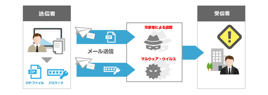 もう1つの問題点は、マルウェアやウイルスの侵入を許してしまう可能性があるという点です。zip暗号化されたファイルは、メールの通信経路におけるマルウェア製品やアンチウイルス製品による検知が難しいため、セキュリティ対策をすり抜けてしまう可能性があうという点が問題視されています。